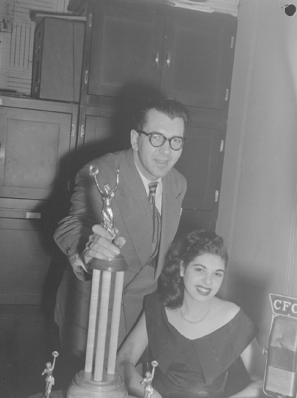 Maurice Bédard tenant un trophée à côté de mademoiselle Kay Parker dans les studios de la station radio C.F.C.F. à Montréal