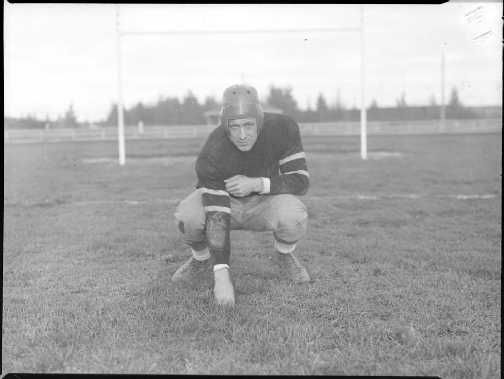 Tom Burns, joueur de football de l'équipe les «Nationals» de Montréal, posant en équipement de sport sur un terrain