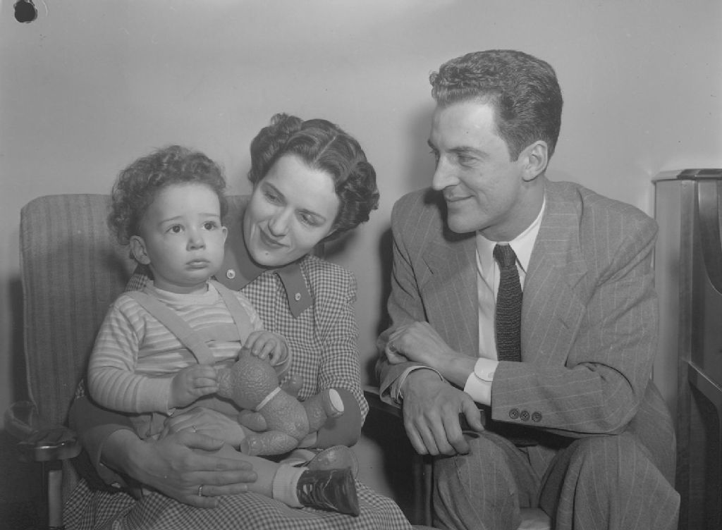 Le commentateur sportif René Lecavalier posant en compagnie de son épouse et de leur fils Pierre. Ils sont à leur domicile situé au 3068, rue Lacombe dans le quartier Côte-des-Neiges à Montréal