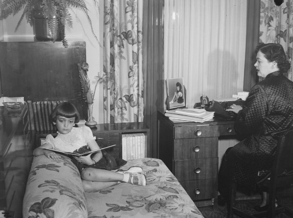 L'auteur radiophonique Jean Despréz (pseudonyme de Laurette Larocque-Auger) tape un scénario à la machine alors que sa fillette, Jacqueline Laurent-Auger, lit sur un canapé. Elles sont à leur domicile du 4124, rue Van Horne à Montréal