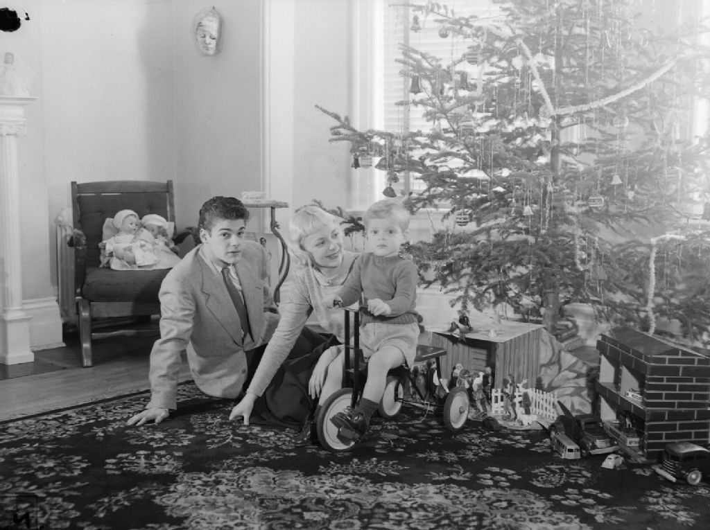Le comédien Robert Gadouas et son épouse Marjolaine Hébert posant devant un sapin de Noël avec leur fils Daniel sur un tricycle de bois. Nous remarquons au pied de l'arbre une crèche et un garage miniature avec divers véhicules ainsi que des poupées sur un fauteuil