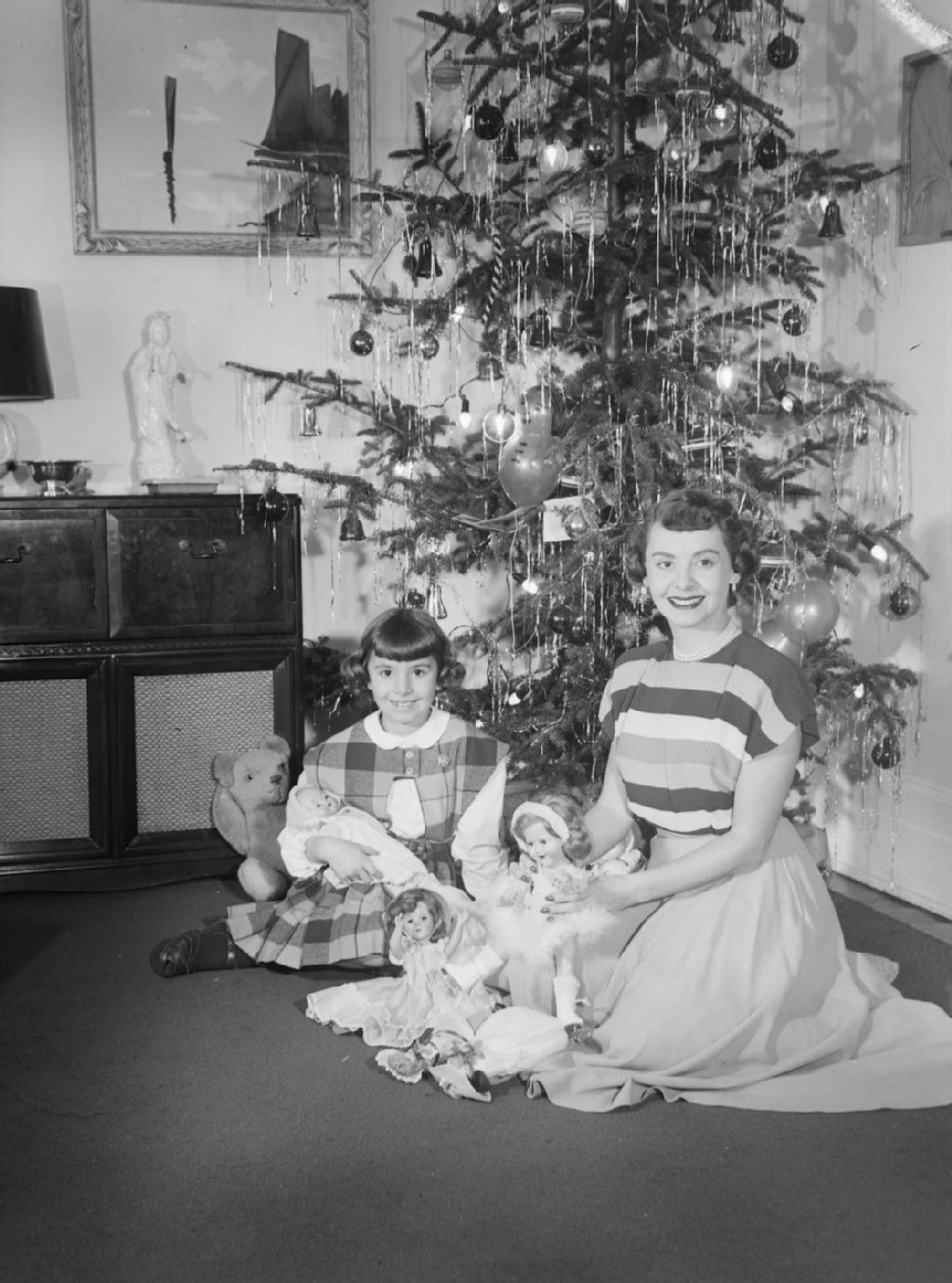 L'animatrice et comédienne Nicole Germain posant assise devant un sapin de Noël avec sa fille, Liette Bourassa, jouant avec ses poupées. Elles sont à leur domicile du 1465, rue Bernard à Outremont