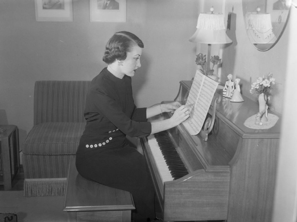 La chanteuse Lucille Dumont annotant une partition assise au piano