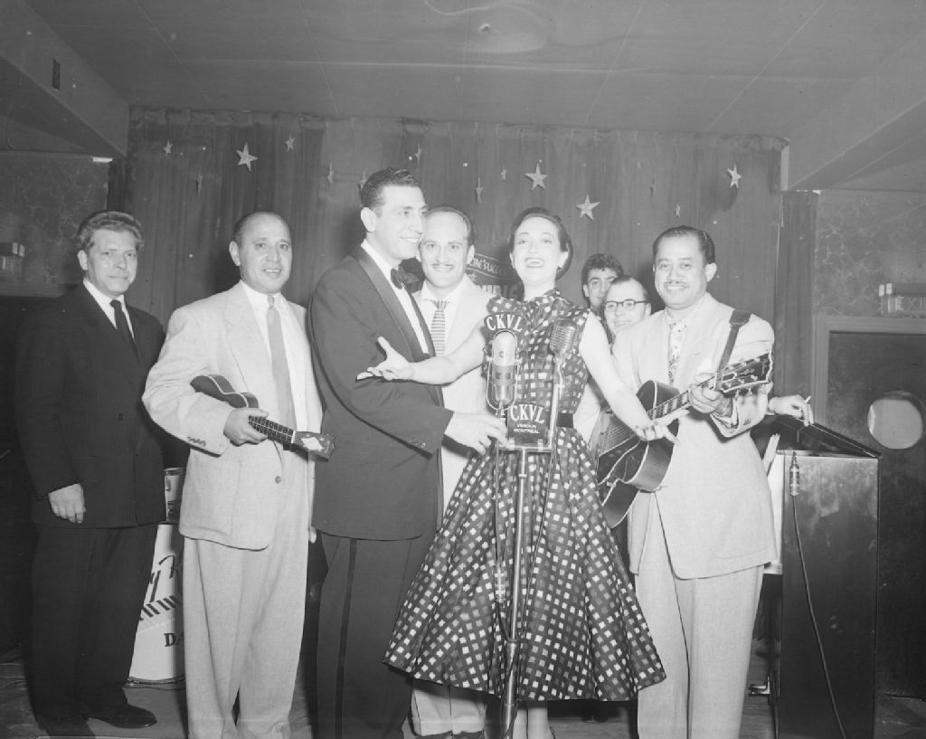 L'actrice Dorothy Lamour est l'invitée de l'émission « Jouez double » diffusée sur CKVL. Cette photographie a été publiée dans l'hebdomadaire « Radiomonde et télémonde »