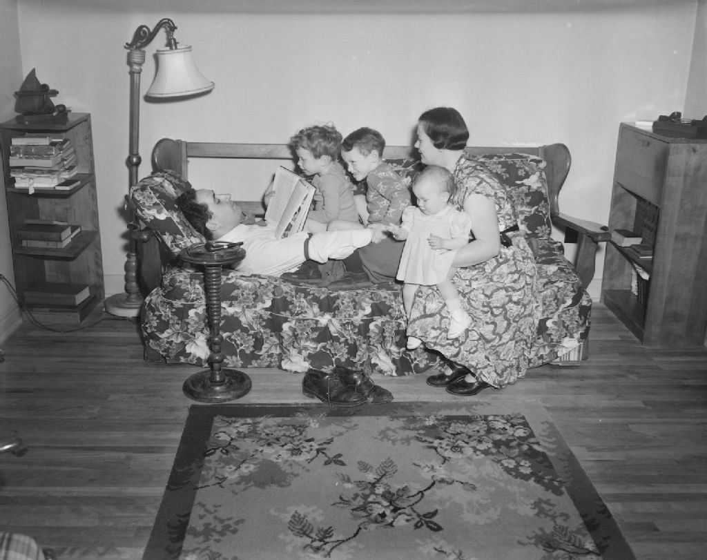 Nous voyons l'annonceur à Radio-Canada Raymond Laplante, sa femme Madeleine Morin et leurs enfants Pierre, Bernard et Monique. Cette photographie a été publiée dans l'hebdomadaire « Radiomonde »
