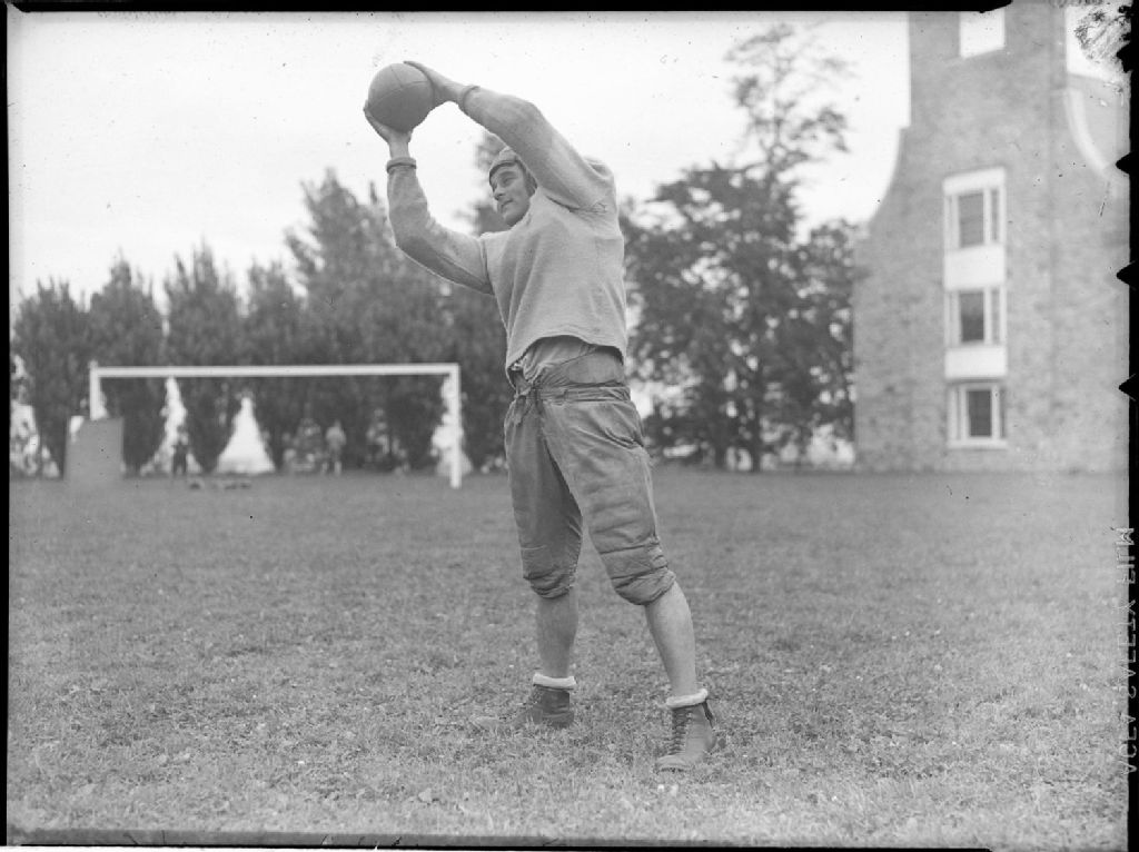 Harold Ditkofsky, membre de l'équipe de football des «Cubs» de Montréal, posant en uniforme en tenant un ballon au-dessus de sa tête