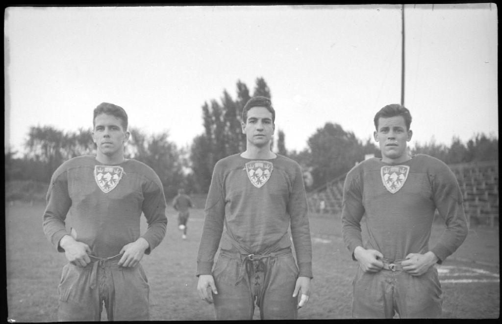Nous voyons trois joueurs de l'équipe de football des «Redmen» de l'Université McGill, posant debout avec les chandails marqués du blason de l'institution