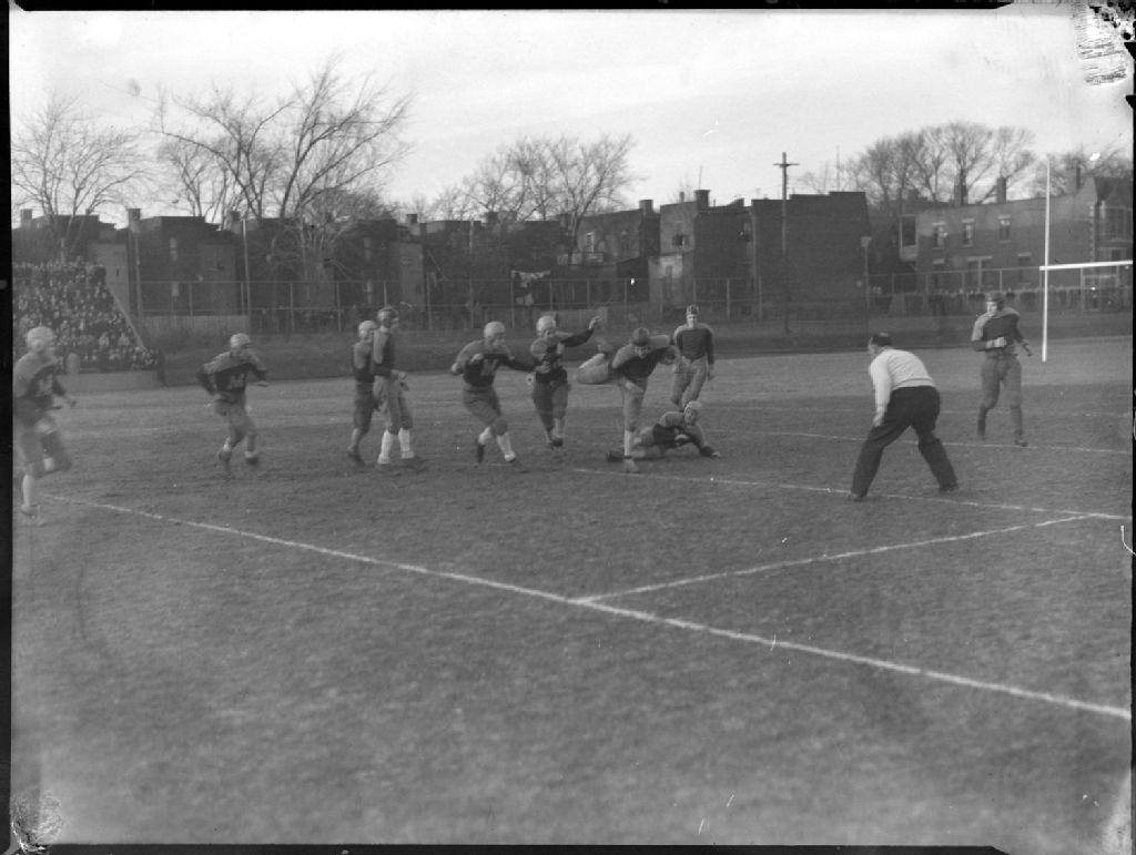 Nous voyons les joueurs des équipes de football «D'Arcy McGee» et «Westhill», s'affrontant lors d'un match. Nous apercevons, à l'arrière-plan, des gradins remplis de spectateurs, des maisons ainsi que la zone des buts