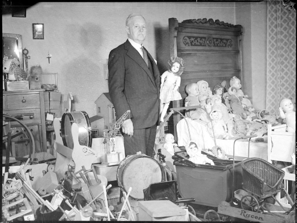 Nous voyons un homme du nom de J. J. Kirkpatrick, en complet et cravate, posant une poupée dans son atelier, au milieu d'une multitude de jouets remis en état grâce à ses soins. Nous remarquons un lit miniature recouvert de poupées de tous styles: jouets de bois, tambours, landaux et divers articles