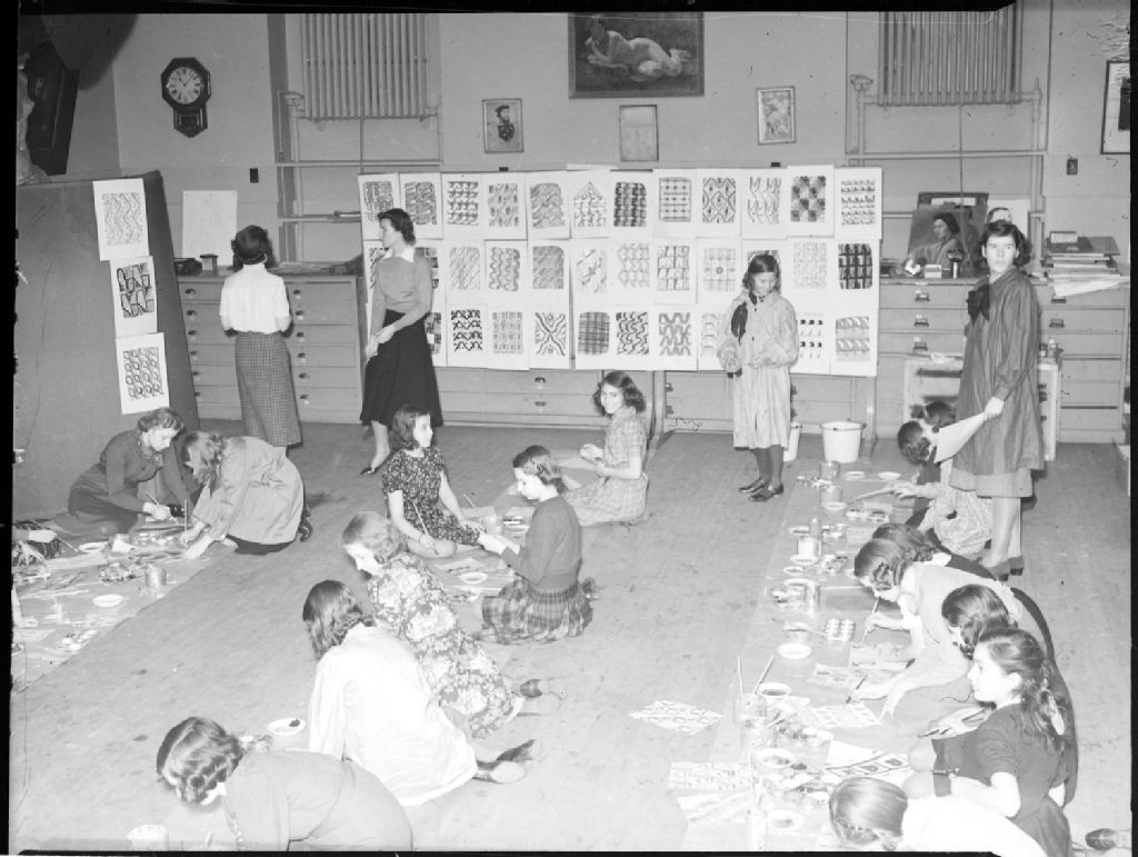 Nous voyons l'intérieur d'une salle de l'«Art Association» de Montréal, 1379, rue Sherbrooke Ouest, avec un groupe de jeunes filles assises au sol et peignant des motifs décoratifs sur des feuilles de papier. Quelques-uns de leurs travaux sont exposés au mur