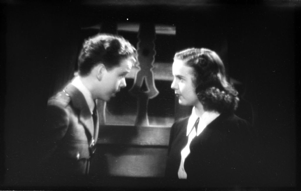 Nous voyons en gros plan le visage d'une jeune comédienne du nom de Deanna Durbin et d'un garçon, jouant dans le film «Mad About Music» présenté au «Palace Theatre», 690 Sainte-Catherine Ouest à Montréal