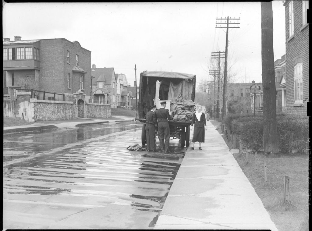Nous voyons le derrière d'un camion de déménagement remplis de bâches, avec deux déménageurs en uniforme et une femme se tenant à proximité du camion, sur l'avenue Notre-Dame- de-Grâce dans l'ouest de Montréal