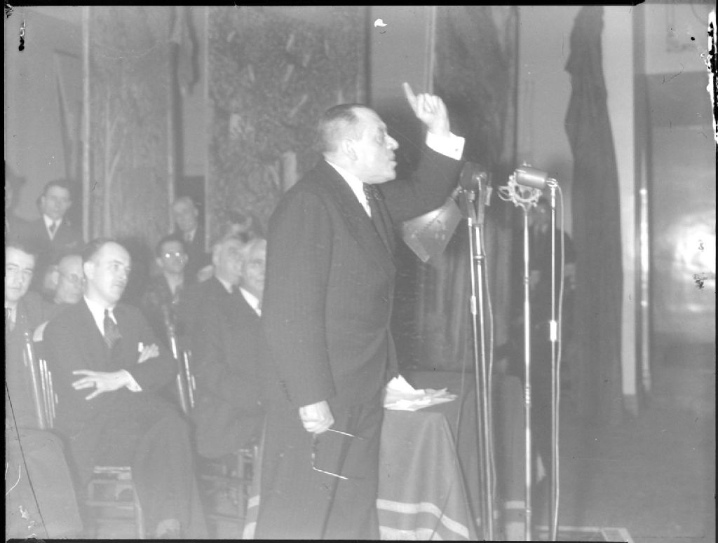 Nous voyons le politicien Camillien Houde, lors d'élections dans le quartier Saint-Henri à Montréal, s'adressant, devant un micro, à un auditoire d'électeurs dans une salle publique