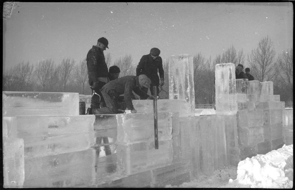 Ouvriers munis de pinces à glace et d'un niveau construisant les murs d'un palais de glace au Parc Lafontaine à Montréal