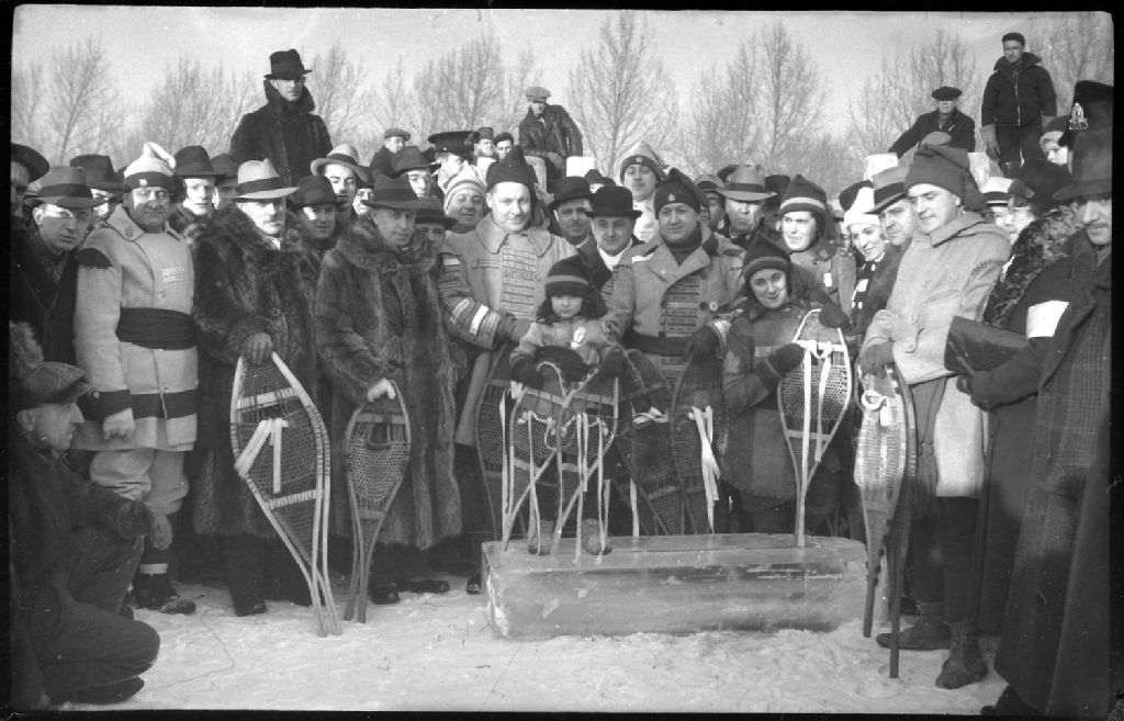Nous voyons le maire de Montréal, monsieur Camillien Houde, en manteau de chat sauvage entouré d'un groupe de personnes en tenues hivernales posant devant un énorme bloc de glace, pierre angulaire d'un palais de glace au Parc Lafontaine à Montréal. Nous apercevons plusieurs raquetteurs, dont un enfant, posant avec des raquettes