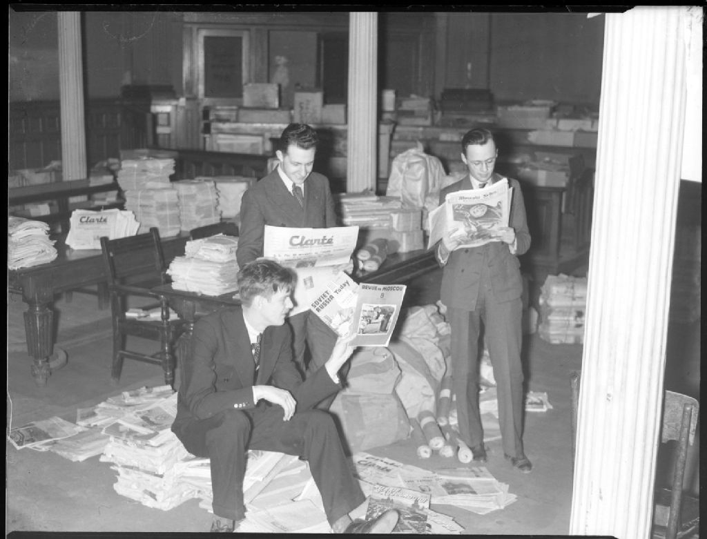 Nous voyons une salle de l'Hôtel de ville de Montréal jonchée de revues, colis et de documents divers d'allégeance communiste confisqués selon la loi du cadenas, notamment «La revue de Moscou», «La Clarté», «Soviet Russia Today». Trois hommes en civil en examinent le contenu