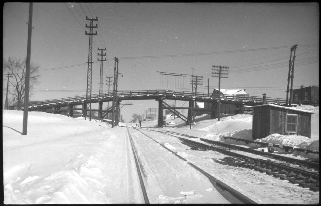 Nous apercevons un pont bordé de rambardes de bois sur l'avenue Westminster dans l'ouest de Montréal. Nous apercevons sous ce pont des rails de chemin de fer, un cabanon et des poteaux électriques