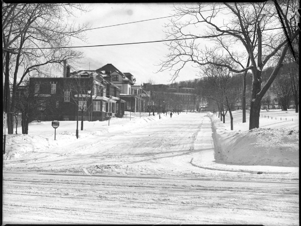 Nous apercevons l'avenue Holyrood, bordée de maisons cossues et d'arbres matures, à l'angle du Chemin de la Côte-Sainte-Catherine à Outremont après un déneigement