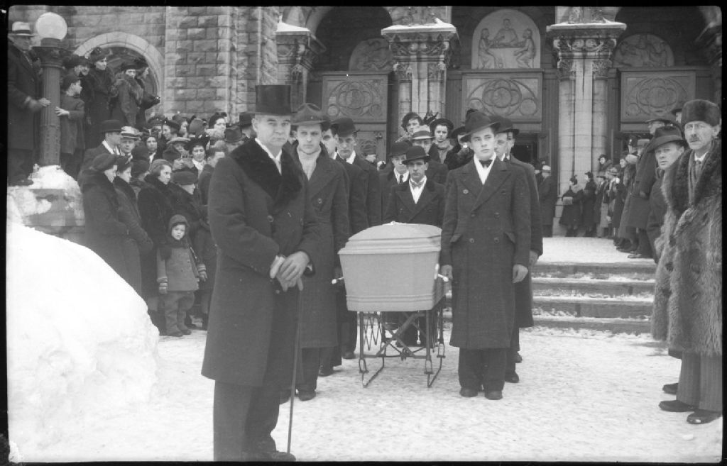 Nous voyons un cortège funèbre à la sortie d'une église de Saint-Hyacinthe; des porteurs se tiennent debout de chaque côté d'un cercueil, sous les yeux des personnes rassemblées pour l'occasion