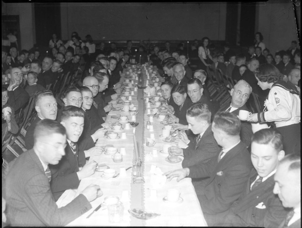 Nous voyons des convives, pères et fils, attablés dans une immense salle lors d'un banquet organisé par l'église unie «Wesley United Church» de Montréal. Nous apercevons quelques femmes faisant le service aux tables, en uniforme à col marin
