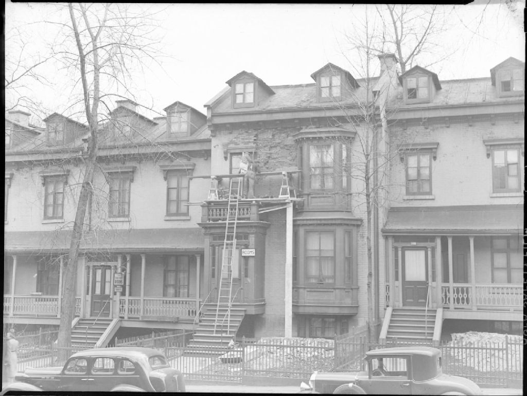 Nous voyons deux maçons montés sur des échafaudages restaurant le mur de brique de la façade de l'ancienne résidence de Lord Strathcona à Montréal, devenue maison de chambres