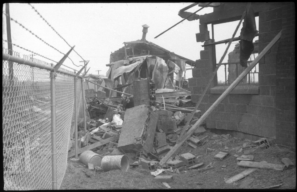 Nous voyons des débris d'entrepôts soufflés sous l'effet de l'explosion de poudre de bronze à Valleyfield