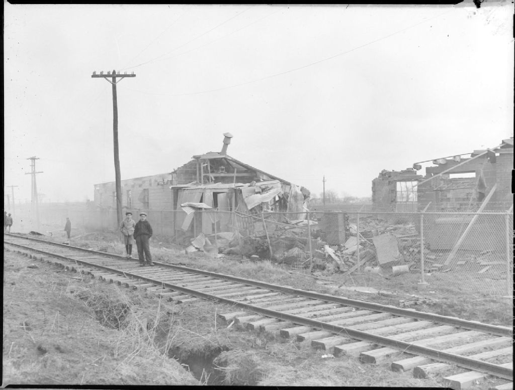 Nous voyons des débris d'entrepôts soufflés sous l'effet de l'explosion de poudre de bronze à Valleyfield. Nous apercevons deux gamins debout sur la voie ferrée à proximité du sinistre