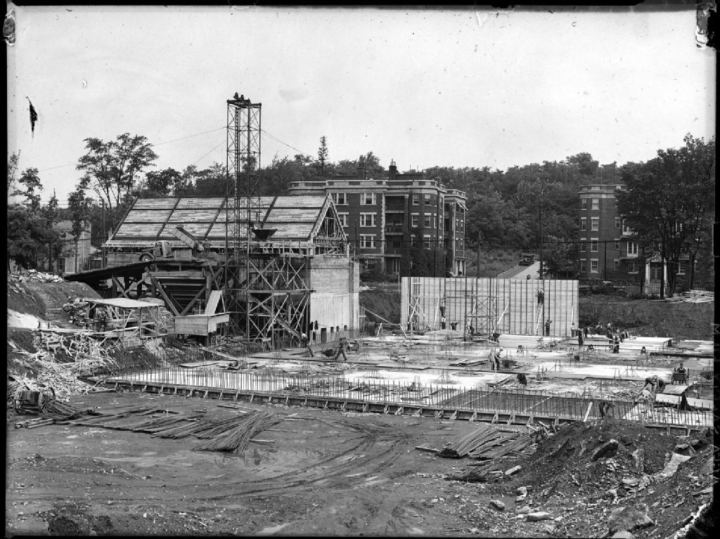 Ouvriers travaillant à la construction d'un bâtiment devant abriter le futur réservoir d'eau du quartier Côte-des-Neiges à Montréal