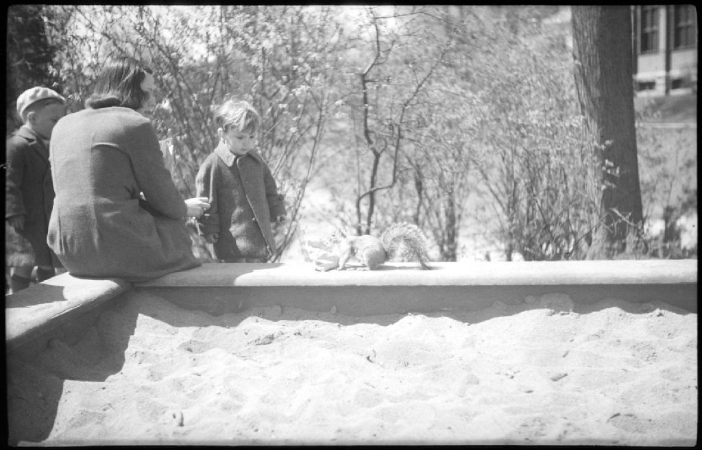 Deux jeunes garçons et une femme regardant un écureuil au parc Westmount situé dans le quadrilatère formé de la rue Sherbrooke Ouest, et des avenues Melville, Landsdowne et Western à Westmount