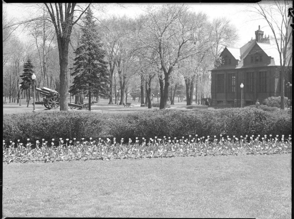 Plate-bande de tulipes devant un canon, des lampadaires, une maison et des promeneurs dans le parc Westmount, compris dans le quadrilatère formé de la rue Sherbrooke Ouest et des avenues Melville, Lansdowne et Western à Westmount