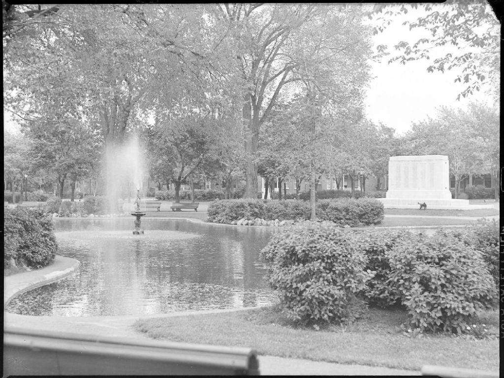 Jet d'eau au milieu d'un bassin devant un monument commémoratif dans le parc Outremont compris dans le quadrilatère formé des avenues Saint-Viateur, Elwood, Outremont et Bloomfield à Outremont