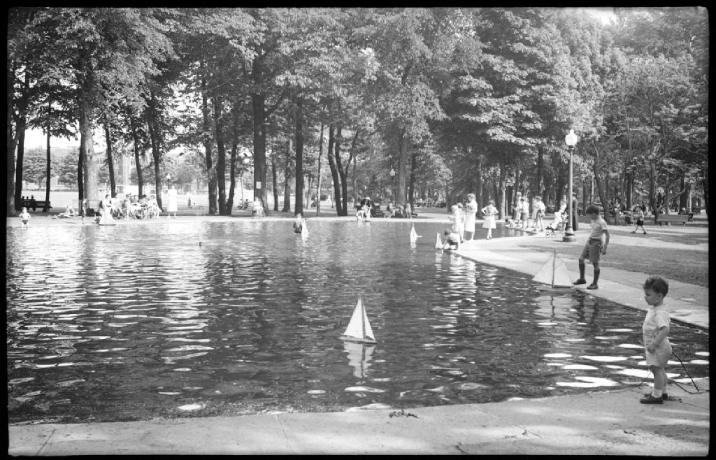 Enfants faisant voguer de petits voiliers sur le bassin d'eau du parc Westmount compris dans le quadrilatère formé de la rue Sherbrooke Ouest, et des avenues Melville, Lansdowne et Western à Westmount. Nous remarquons quelques promeneurs, une dame avec un landau et une fillette à tricycle