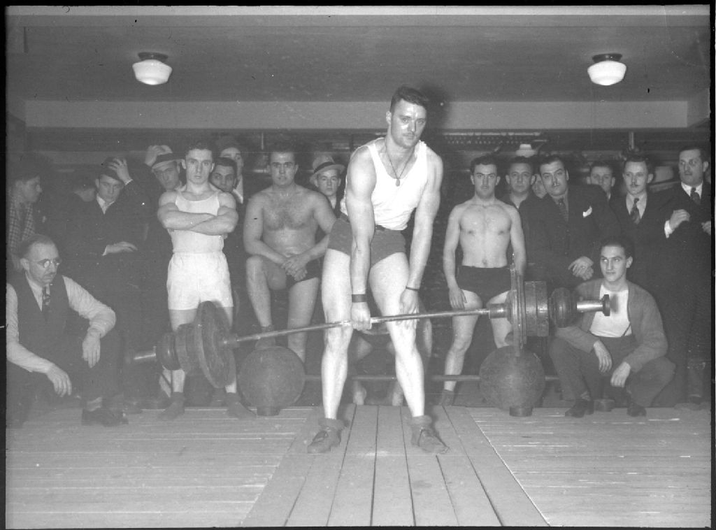 Noël Langlois levant des poids d'une seule main au gymnase Samson, devant d'autres lutteurs et spectateurs