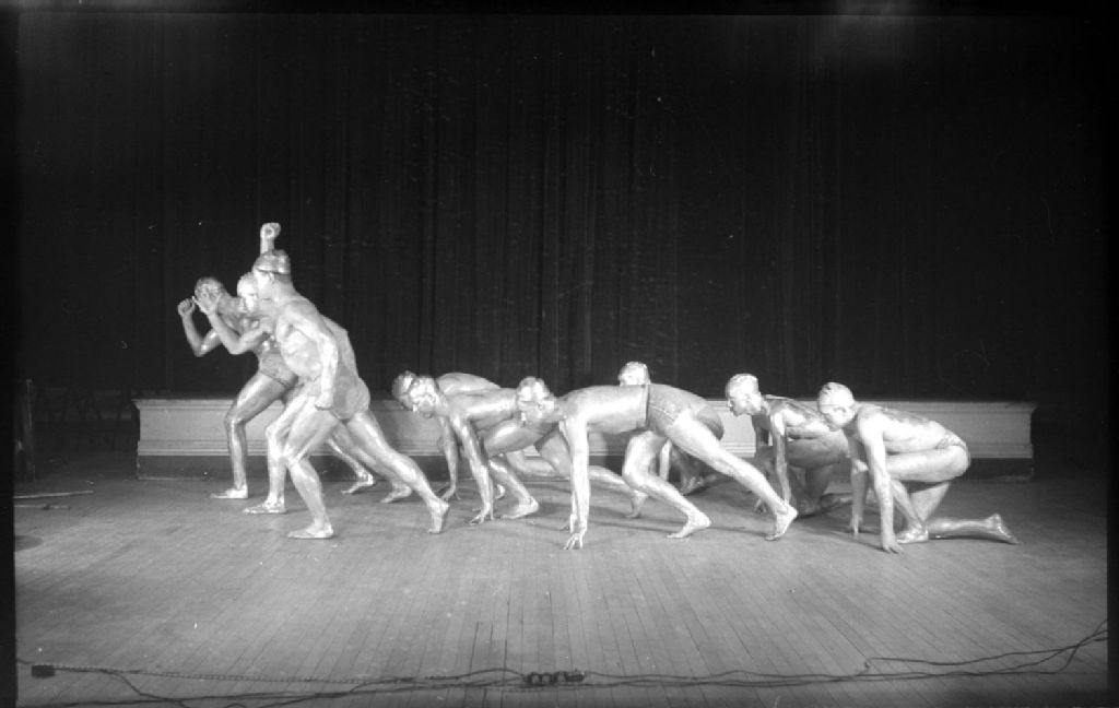 Gymnastes exécutant un tableau sur le thème des origines lors du spectacle «Men of Bronze» dans le gymnase du Y.M.C.A. de Notre-Dame-de-Grâce à Montréal