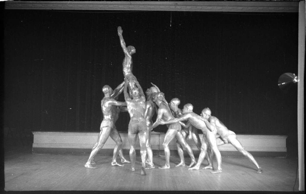 Gymnastes tenant à bout de bras un des leurs, lors du spectacle «Men of Bronze» dans le gymnase du Y.M.C.A. de Notre-Dame-de-Grâce à Montréal
