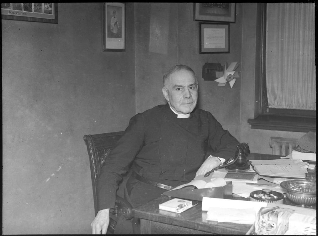 Le vénérable John M. Almond, archidiacre du «Trinity Memorial Church», assis à son bureau
