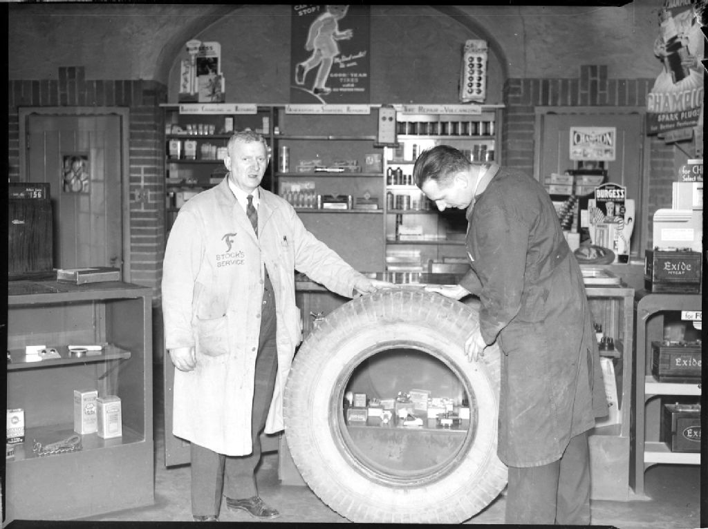 Deux garagistes dont Albert Stock à l'intérieur de la station service «Stock's» située au 5811 Sherbrooke Ouest à Montréal. Nous remaquons des affiches publicitaires dont une de la compagnie de pneus Good Year