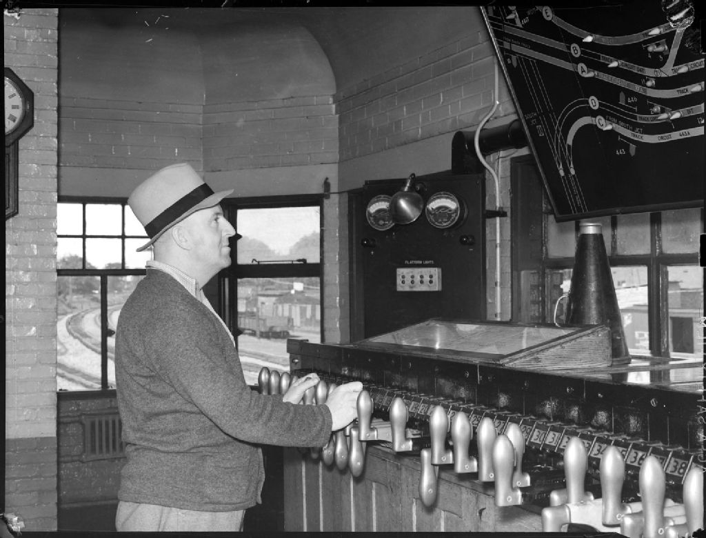 Nous voyons un homme du nom de Ray Kahala actionnant des manettes sur une console pour système d'aiguillage ferroviaire. Nous apercevons une horloge murale et un tableau illustrant un réseau de voies ferroviaires, de même que des rails de chemin de fer derrière une fenêtre