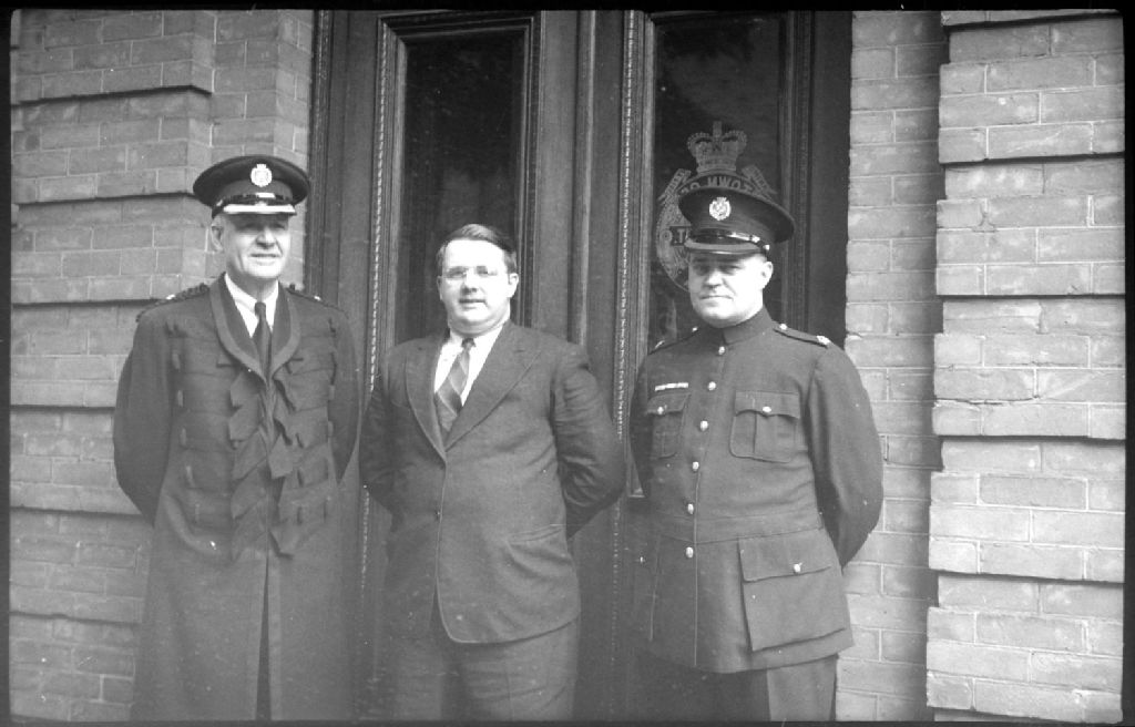 Nous voyons une image de trois hommes posant devant l'entrée de l'édifice du corps policier de Westmount, dont deux posant en uniforme : Walter Gough à gauche et le chef Bill Wren à droite, en compagnie de Tracy Ludington