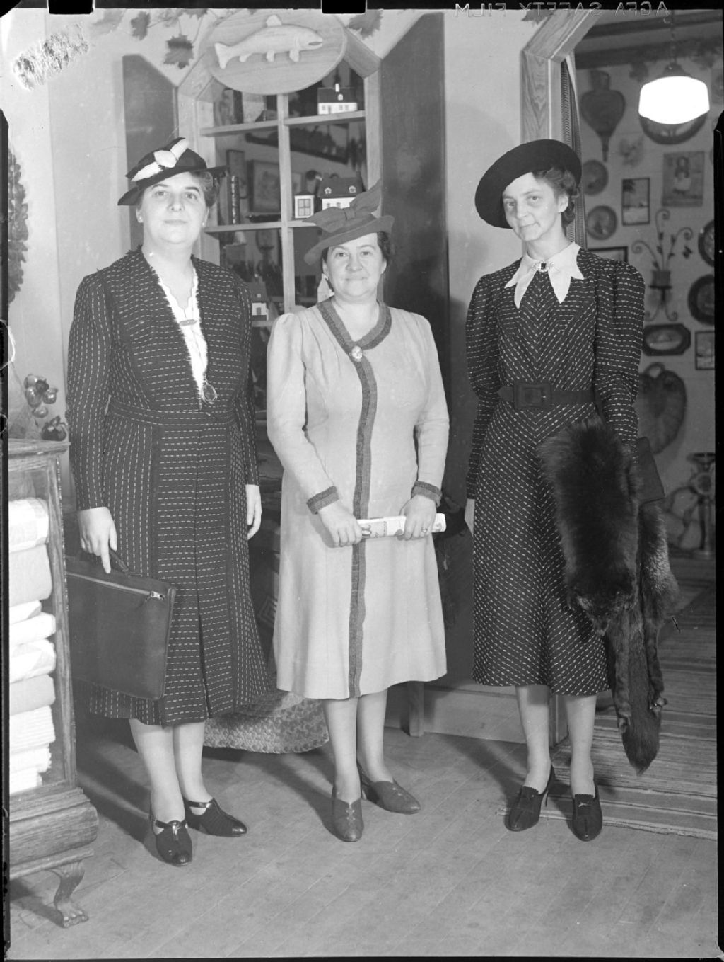 Nous voyons trois femmes en robes et chapeaux posant debout dans la boutique d'artisanat «Chez Fanchette», située Chemin Côte-Sainte-Catherine à Montréal. Nous apercevons derrière elles de menus articles d'artisanat