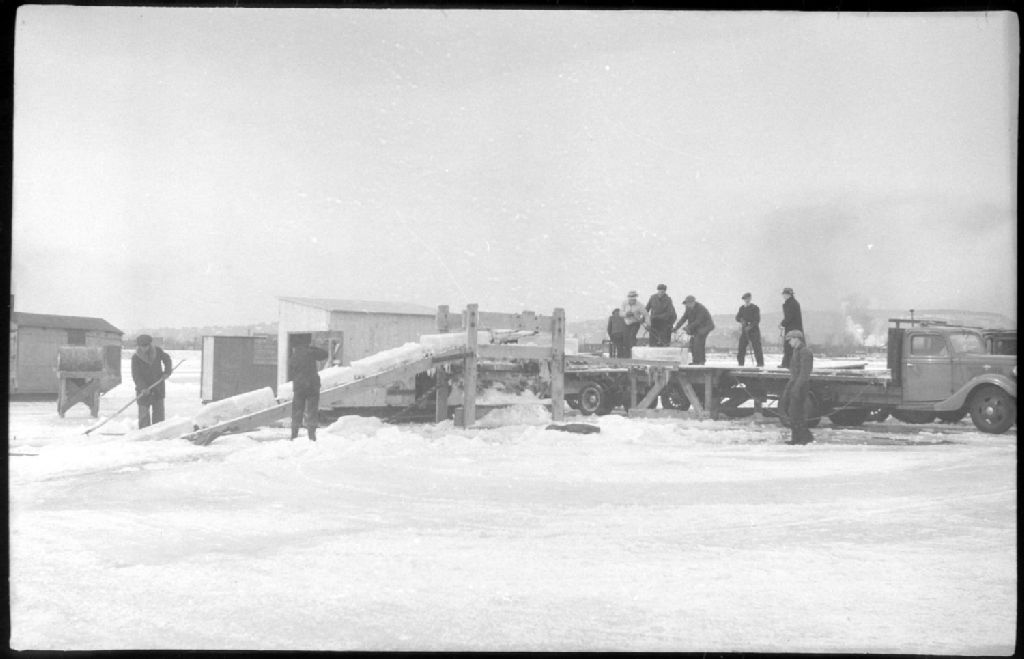 Lors d'une opération de coupe de glace sur les battures du fleuve Saint-Laurent, nous voyons des blocs de glace chargés sur un camion. Nous apercevons des ouvriers agrippant les blocs de glace à l'aide de gaffes pour les monter sur une rampe de chargement et d'autres ouvriers les plaçant à l'aide de pinces à glace sur des plates-formes de camions