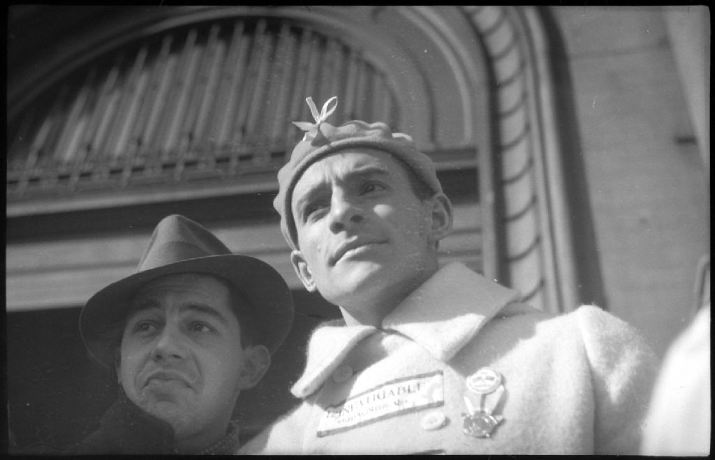 Nous voyons le marathonien Gérard Côté, posant en compagnie d'un autre homme. Le coureur porte l'inscription «L'Infatigable» sur son manteau et arbore une médaille