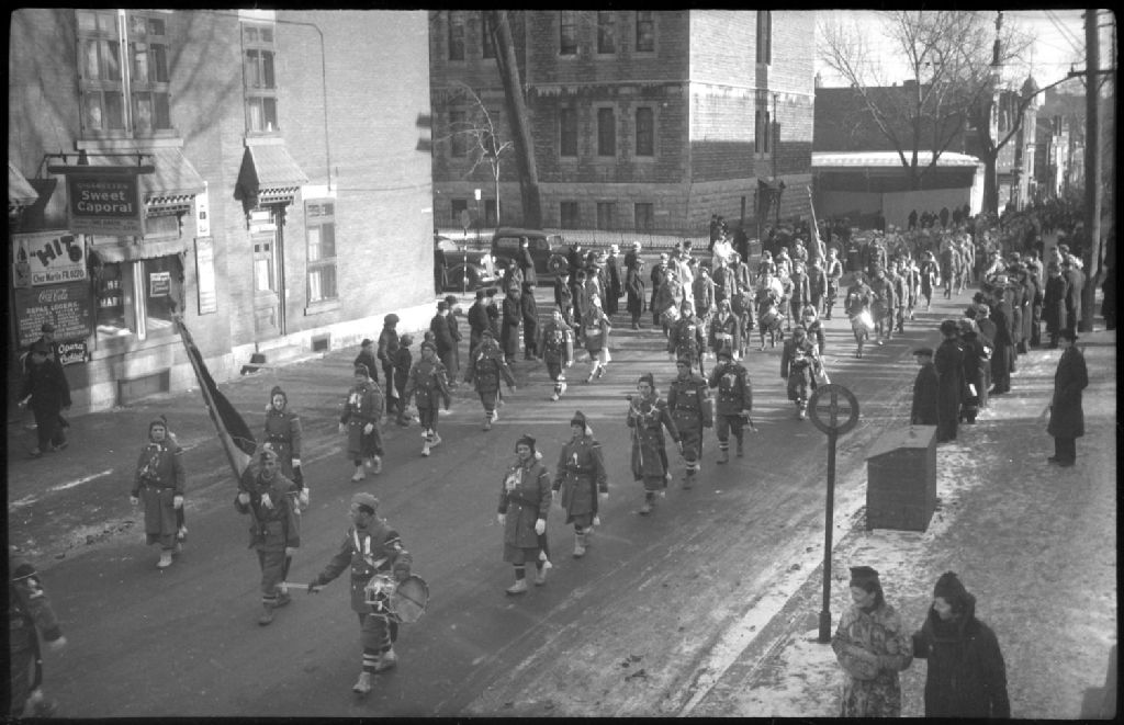 Nous voyons un club de raquetteurs défilant en costume et arborant des étendards sur la rue Ontario Est à Montréal. Nous apercevons la façade de la boutique Chez Martin Ltée, située au 3880 rue Ontario ESt, placardée de nombreuses réclames publicitaires, dont les marques Sweet Caporal et Coca-Cola