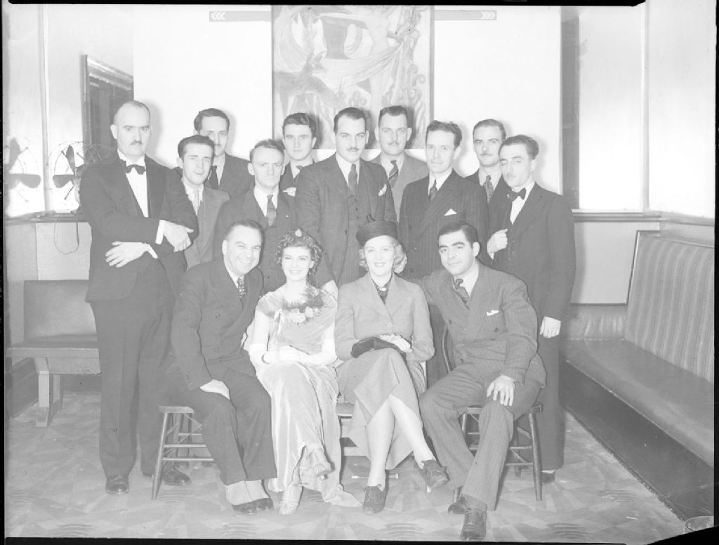 Nous apercevons un groupe posant lors d'une soirée organisée par le «Jolly Boys Ski Club» à la salle de danse du Palais d'Or, situé au 1226 rue Stanley dans l'ouest de Montréal. Nous remarquons, au mileu d'un groupe d'hommes en complets et cravates, deux femmes dont l'une en robe de soirée avec bouquet de corsage et l'autre en tailleur et chapeau. Nous distinguons aussi une oeuvre peinte de style art déco au mur, un ventilateur et une banquette