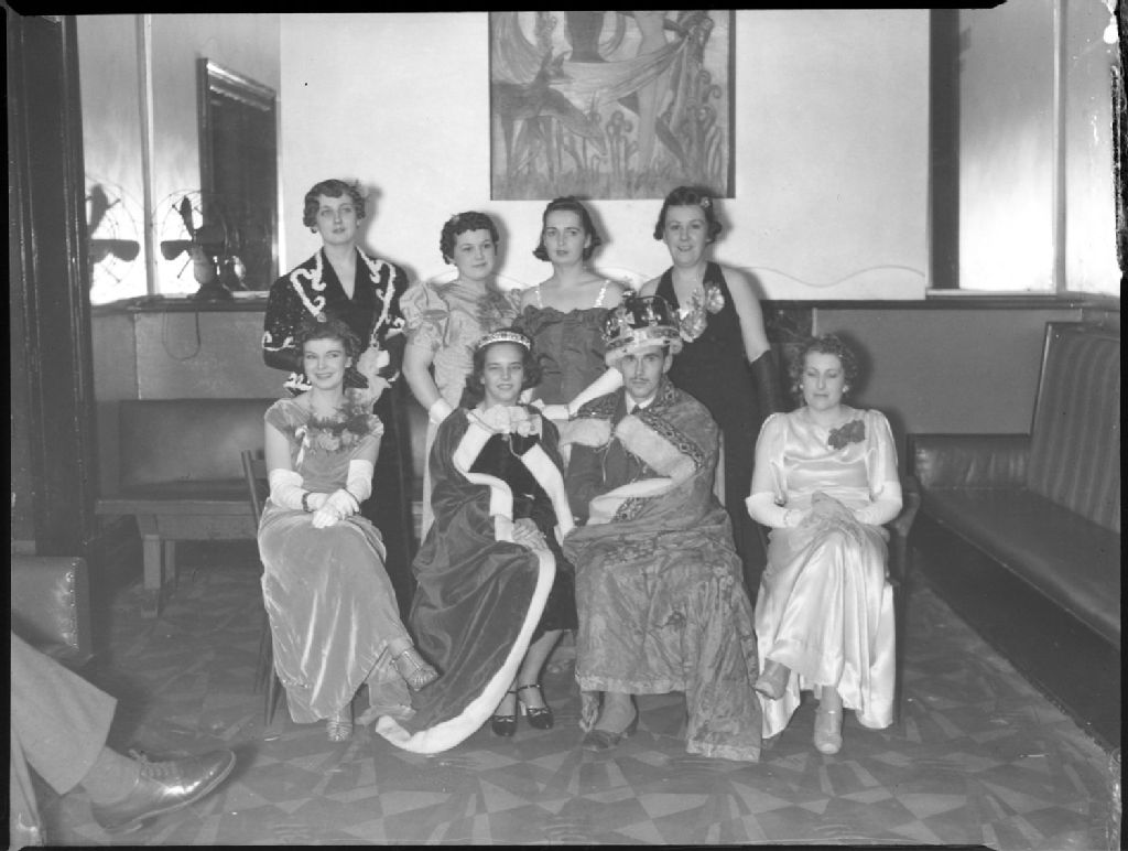 Nous apercevons un groupe posant lors d'une soirée organisée par le «Jolly Boys Ski Club» à la salle de danse du Palais d'Or, situé au 1226 rue Stanley dans l'ouest de Montréal. Nous remarquons, au mileu d'un groupe de femmes en robe de soirée, un couple portant des capes longues bordées de fourrure et couronné de diadèmes. Nous distinguons aussi une oeuvre peinte de style art déco au mur, un ventilateur et une banquette