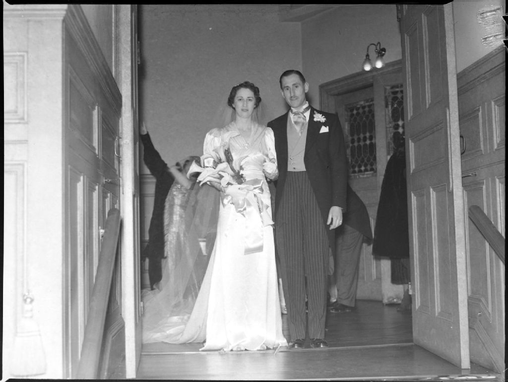 Nous voyons Madame et Monsieur Jenkins posant le jour de leurs noces dans le portique d'une église à Montréal. La mariée porte une robe longue drapée et le marié porte un toxedo et un col avec lavallière