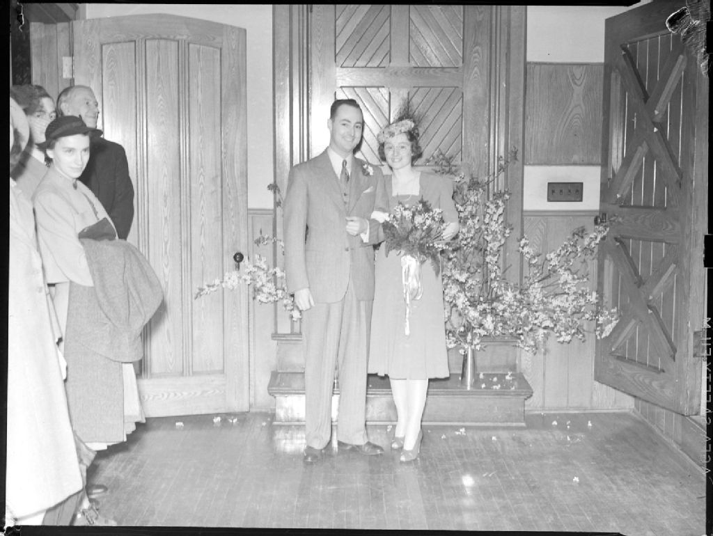 Nous voyons le couple Pacaud et Butters, posant le jour de leurs noces dans le hall d'entrée de l'église St. James the Apostle, située au 1439 Sainte-Catherine Ouest dans l'ouest de Montréal