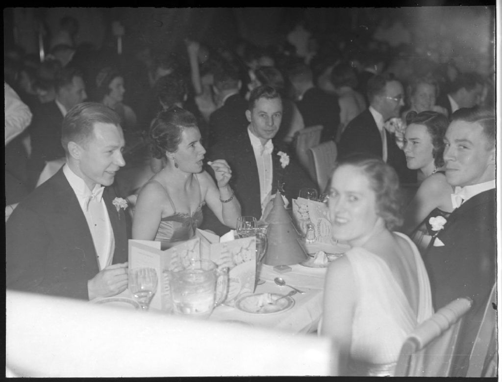 Lors d'un souper de bal de neige organisé par la «Junior League» à Montréal, nous voyons trois couples de convives en tenue de soirée attablés à l'avant-plan et d'autres le long de rangées de tables dressées pour l'occasion