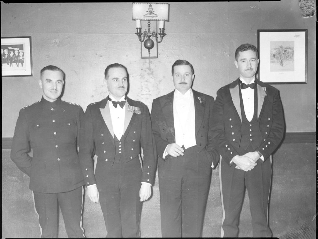 Lors d'une rencontre de fusiliers sur la rue Craig (Saint-Antoine) à Montréal, nous voyons quatre militaires posant debout en tuxedo dans un mess d'officiers. Nous apercevons des photographies d'officiers au mur et un blason avec une devise derrière eux