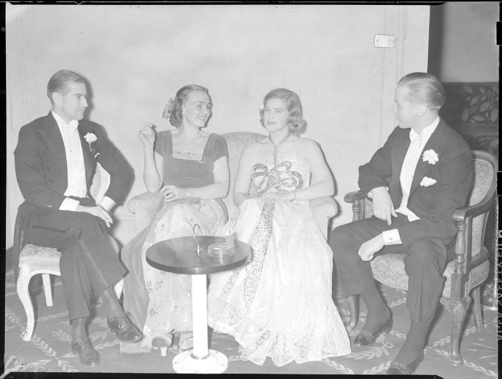 Lors d'un souper de bal de neige organisé par la «Junior League», nous voyons deux couples en tenue de soirée posant assis dans un salon cossu autour d'une table à café